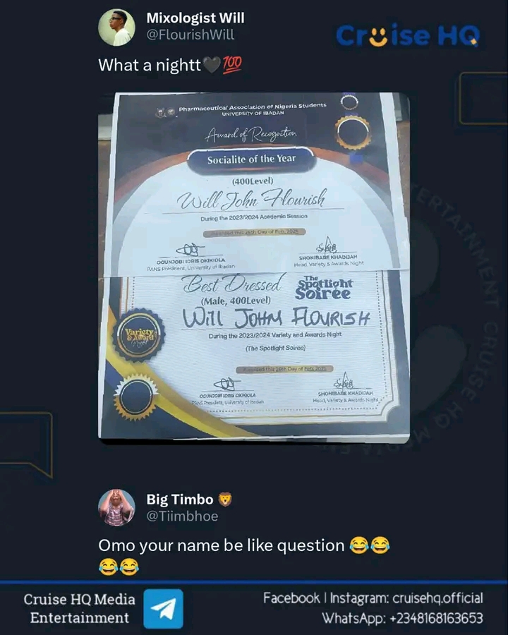 A Pharmacy Student of University of Ibadan (UI) has taken social media by storm, not just for his achievements but for his unusual and unique name with “Will John Flourish”.