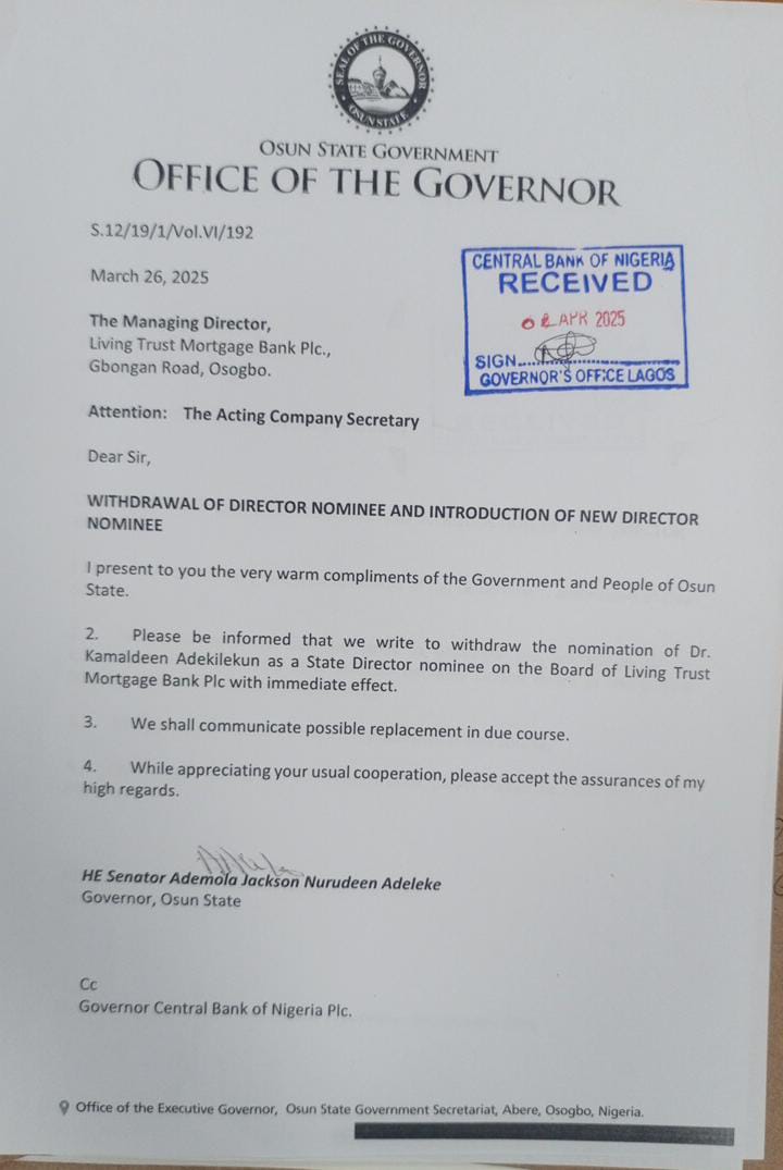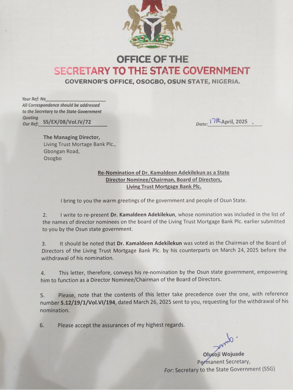 The April 17 letter partly, “I write to re-present Dr. Kamaldeen Adekilekun, whose nomination was included in the list of the names of director nominees on the board of the Living Trust Mortgage Bank Plc. earlier submitted to you by the Osun state government.